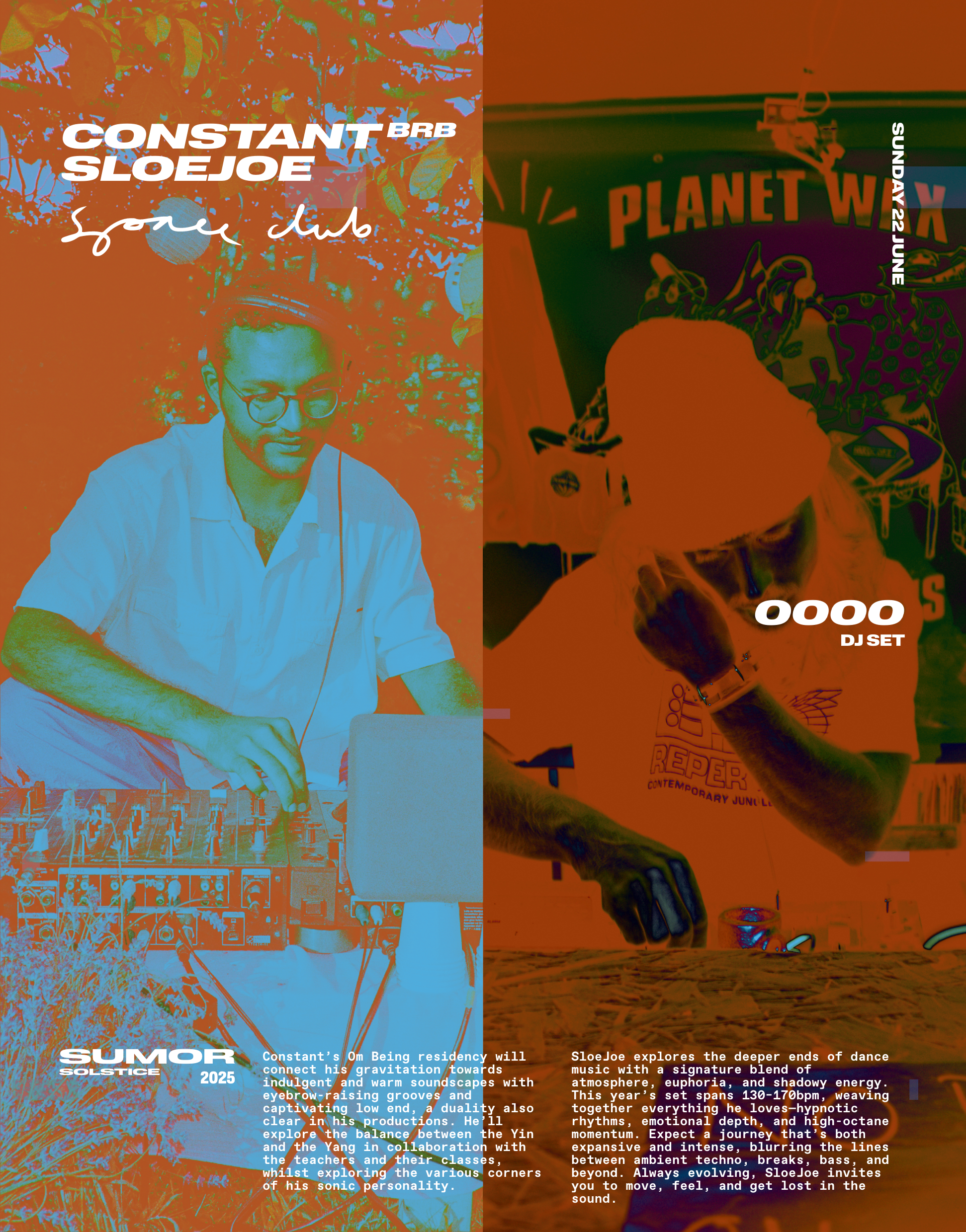 Constant’s Om Being residency will connect his gravitation towards indulgent and warm soundscapes with eyebrow-raising grooves and captivating low end, a duality also clear in his productions. He’ll explore the balance between the Yin and the Yang in collaboration with the teachers and their classes, whilst exploring the various corners of his sonic personality.