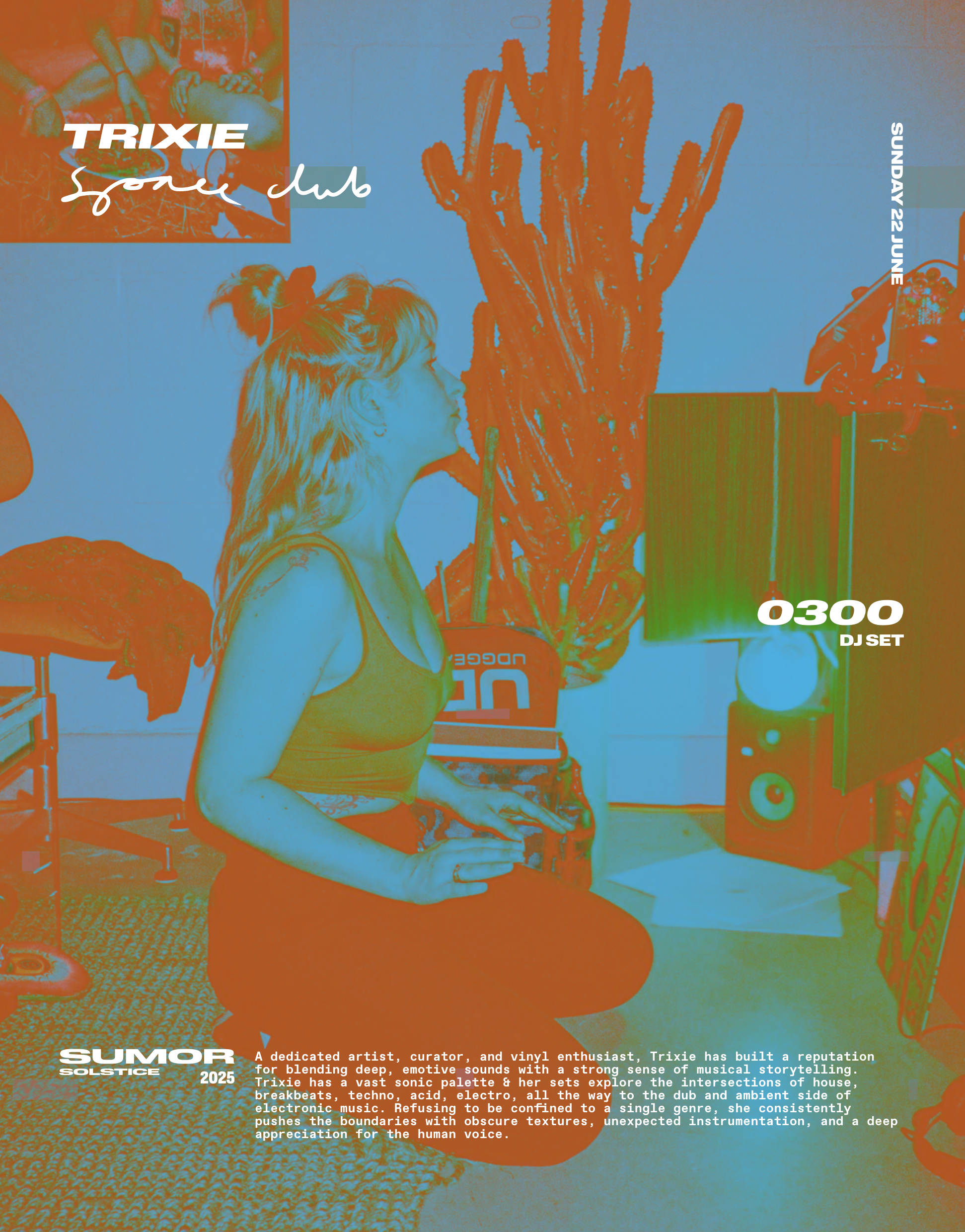 A dedicated artist, curator, and vinyl enthusiast, Trixie has built a reputation for blending deep, emotive sounds with a strong sense of musical storytelling. Trixie has a vast sonic palette & her sets explore the intersections of house, breakbeats, techno, acid, electro, all the way to the dub and ambient side of electronic music. Refusing to be confined to a single genre, she consistently pushes the boundaries with obscure textures, unexpected instrumentation, and a deep appreciation for the human voice.