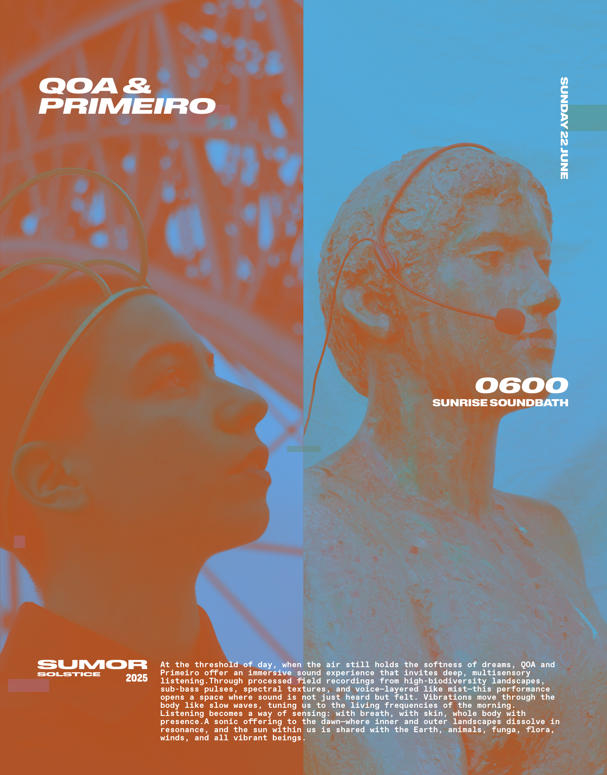 At the threshold of day, when the air still holds the softness of dreams, QOA and Primeiro offer an immersive sound experience that invites deep, multisensory listening.Through processed field recordings from high-biodiversity landscapes, sub-bass pulses, spectral textures, and voice—layered like mist—this performance opens a space where sound is not just heard but felt. Vibrations move through the body like slow waves, tuning us to the living frequencies of the morning.