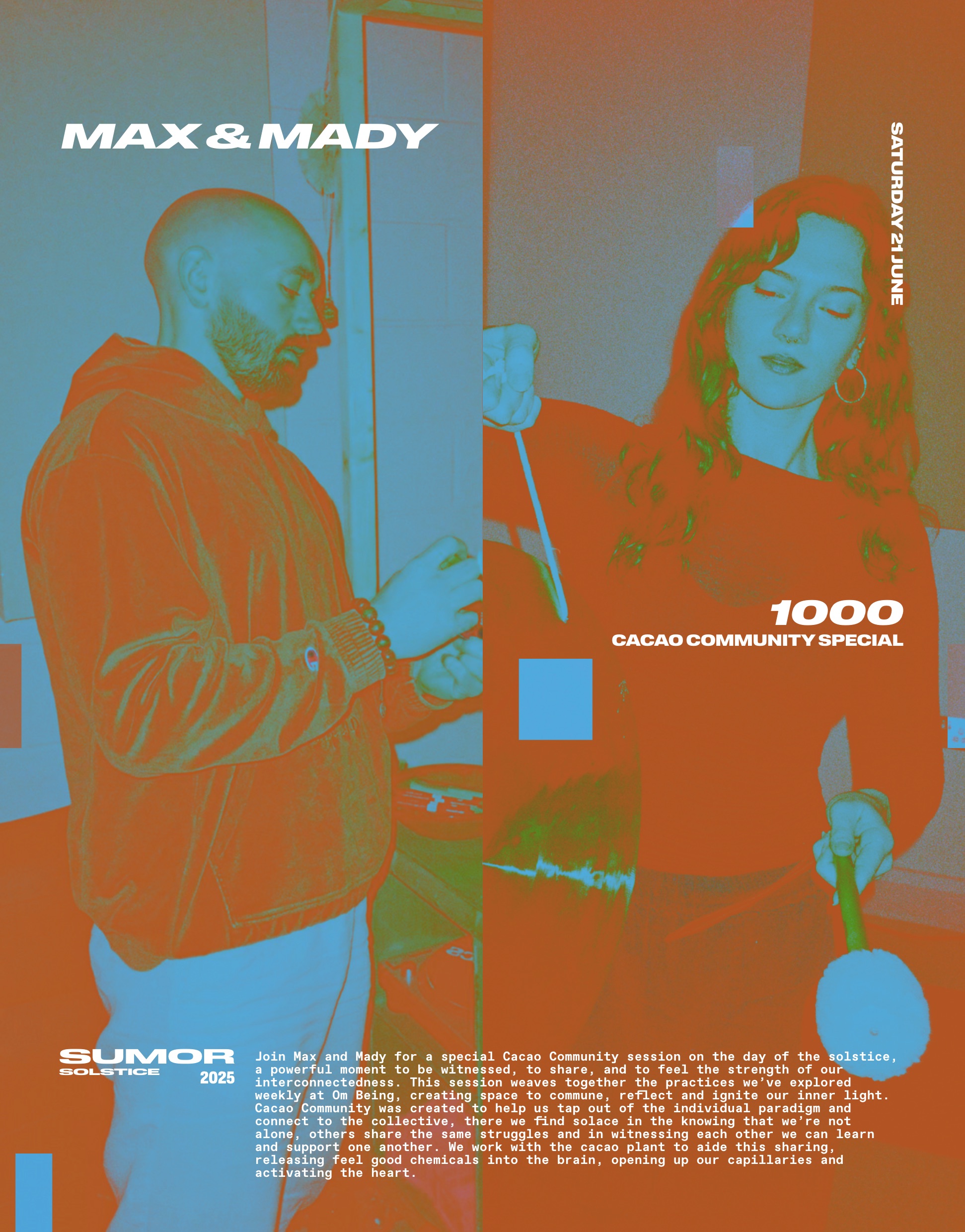 Join Max and Mady for a special Cacao Community session on the day of the solstice, a powerful moment to be witnessed, to share, and to feel the strength of our interconnectedness. This session weaves together the practices we’ve explored weekly at Om Being, creating space to commune, reflect and ignite our inner light. Cacao Community was created to help us tap out of the individual paradigm and connect to the collective, there we find solace in the knowing that we’re not alone, others share the same struggles and in witnessing each other we can learn and support one another. We work with the cacao plant to aide this sharing, releasing feel good chemicals into the brain, opening up our capillaries and activating the heart.
