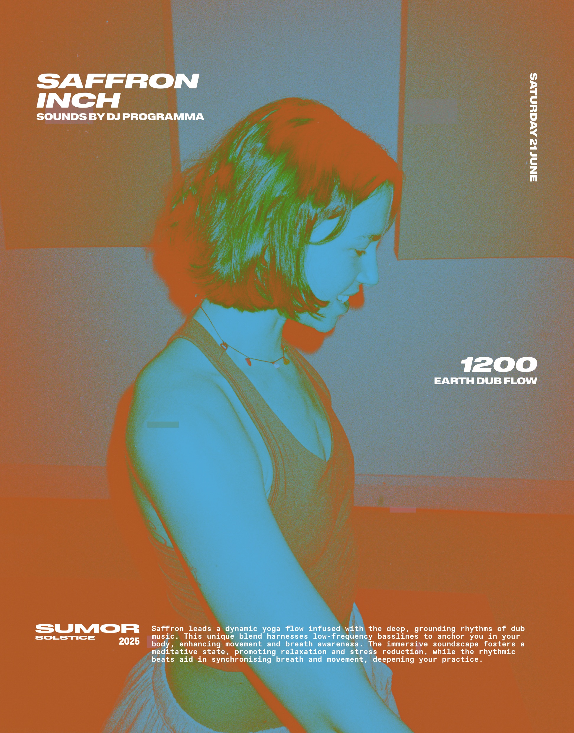 Saffron leads a dynamic yoga flow infused with the deep, grounding rhythms of dub music. This unique blend harnesses low-frequency basslines to anchor you in your body, enhancing movement and breath awareness. The immersive soundscape fosters a meditative state, promoting relaxation and stress reduction, while the rhythmic beats aid in synchronising breath and movement, deepening your practice.