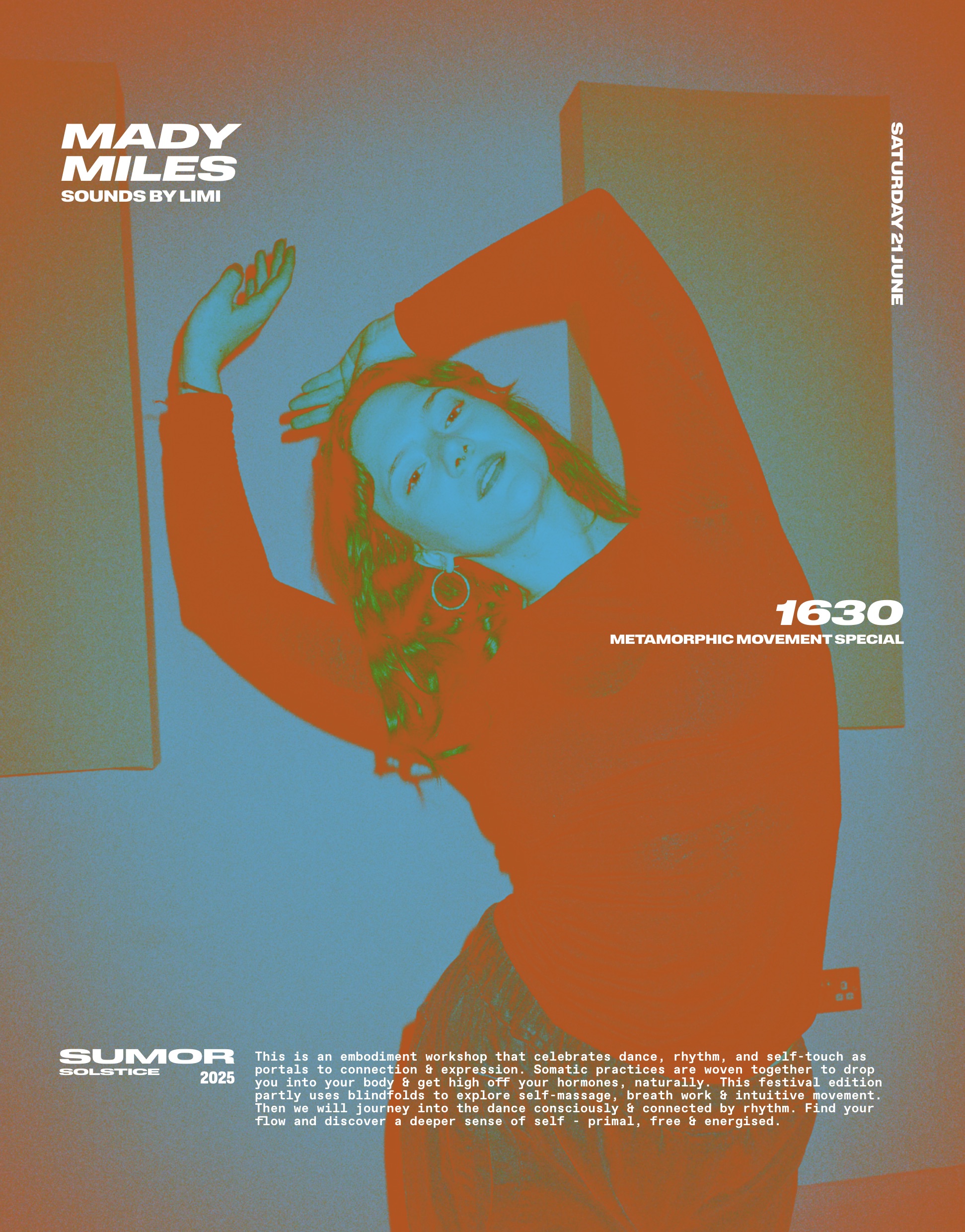 This is an embodiment workshop that celebrates dance, rhythm, and self-touch as portals to connection & expression. Somatic practices are woven together to drop you into your body & get high off your hormones, naturally. This festival edition partly uses blindfolds to explore self-massage, breath work & intuitive movement. Then we will journey into the dance consciously & connected by rhythm. Find your flow and discover a deeper sense of self - primal, free & energised.