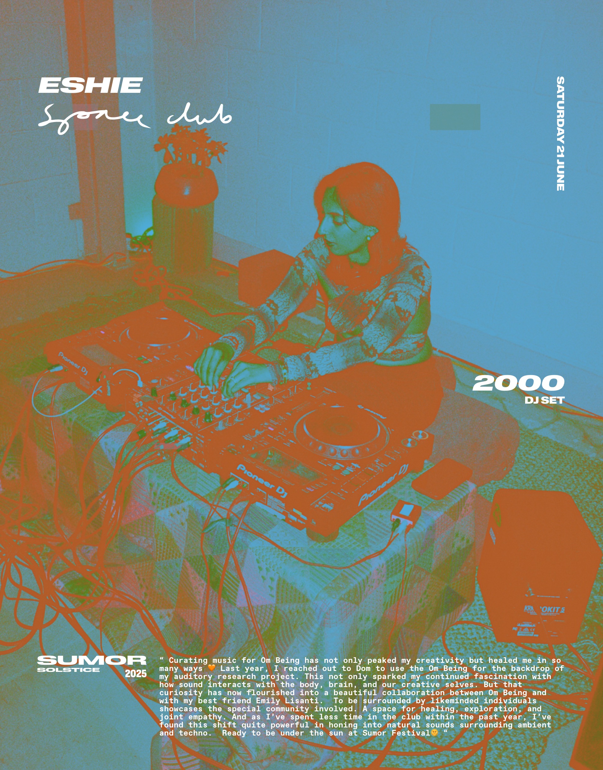“Curating music for Om Being has not only peaked my creativity but healed me in so many ways 🧡 Last year, I reached out to Dom to use the Om Being for the backdrop of my auditory research project. This not only sparked my continued fascination with how sound interacts with the body, brain, and our creative selves. But that curiosity has now flourished into a beautiful collaboration between Om Being and with my best friend Emily Lisanti. To be surrounded by likeminded individuals showcases the special community involved. A space for healing, exploration, and joint empathy. And as I’ve spent less time in the club within the past year, I’ve found this shift quite powerful in honing into natural sounds surrounding ambient and techno. Ready to be under the sun at Sumor Festival🌞 “