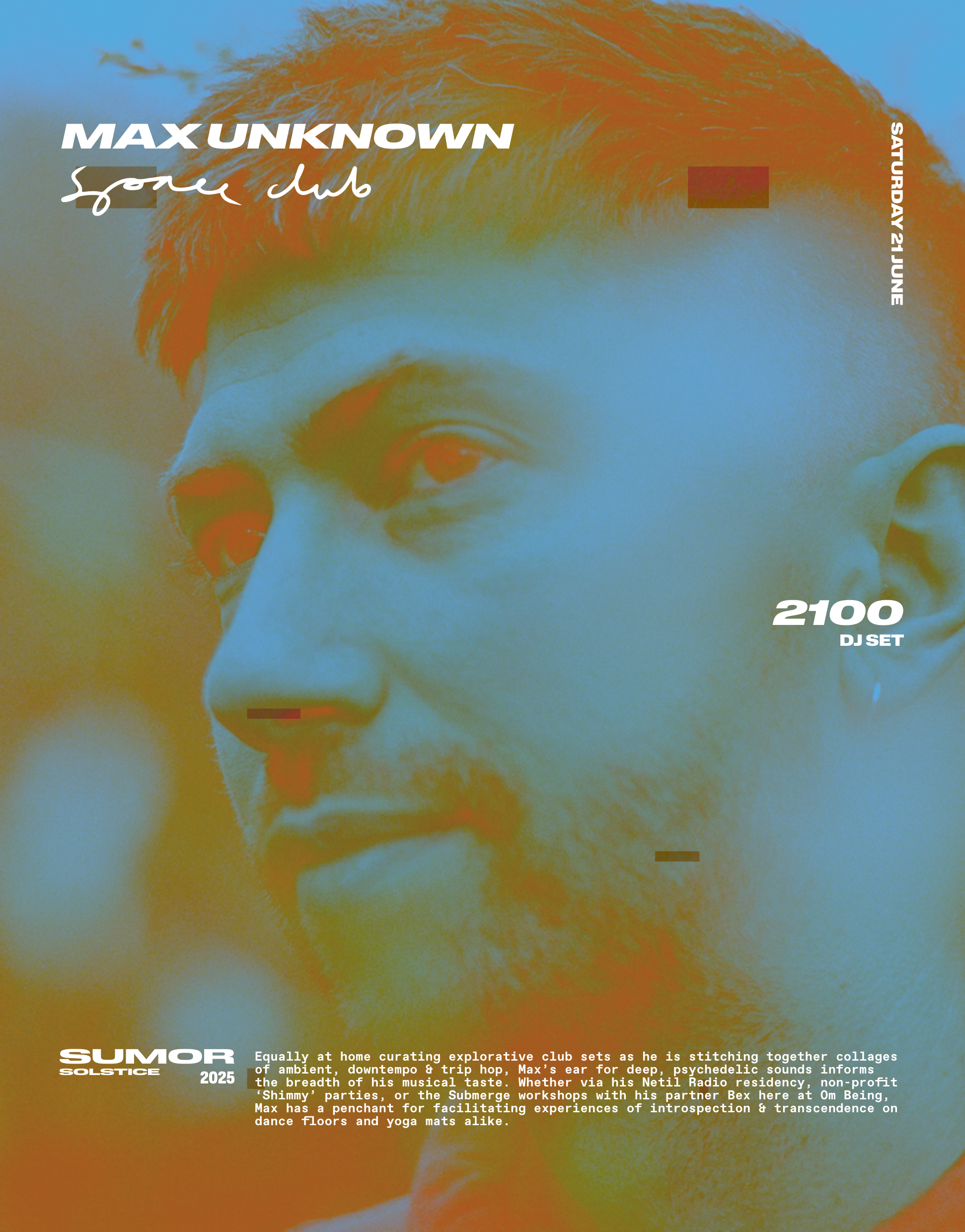 Equally at home curating explorative club sets as he is stitching together collages of ambient, downtempo & trip hop, Max’s ear for deep, psychedelic sounds informs the breadth of his musical taste. Whether via his Netil Radio residency, non-profit ‘Shimmy’ parties, or the Submerge workshops with his partner Bex here at Om Being, Max has a penchant for facilitating experiences of introspection & transcendence on dance floors and yoga mats alike.