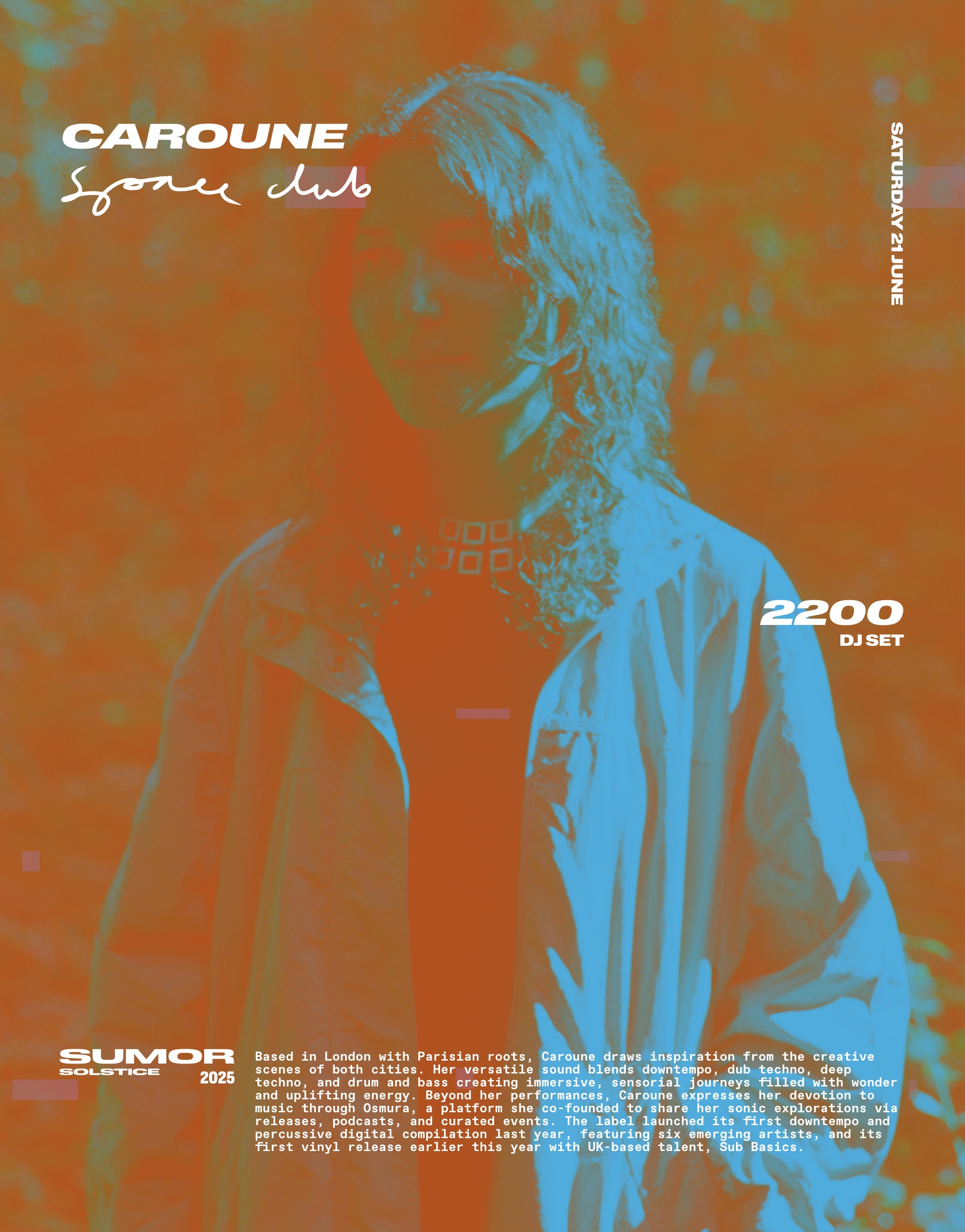 and uplifting energy. Beyond her performances, Caroune expresses her devotion to music through Osmura, a platform she co-founded to share her sonic explorations via releases, podcasts, and curated events. The label launched its first downtempo and percussive digital compilation last year, featuring six emerging artists, and its first vinyl release earlier this year with UK-based talent, Sub Basics.