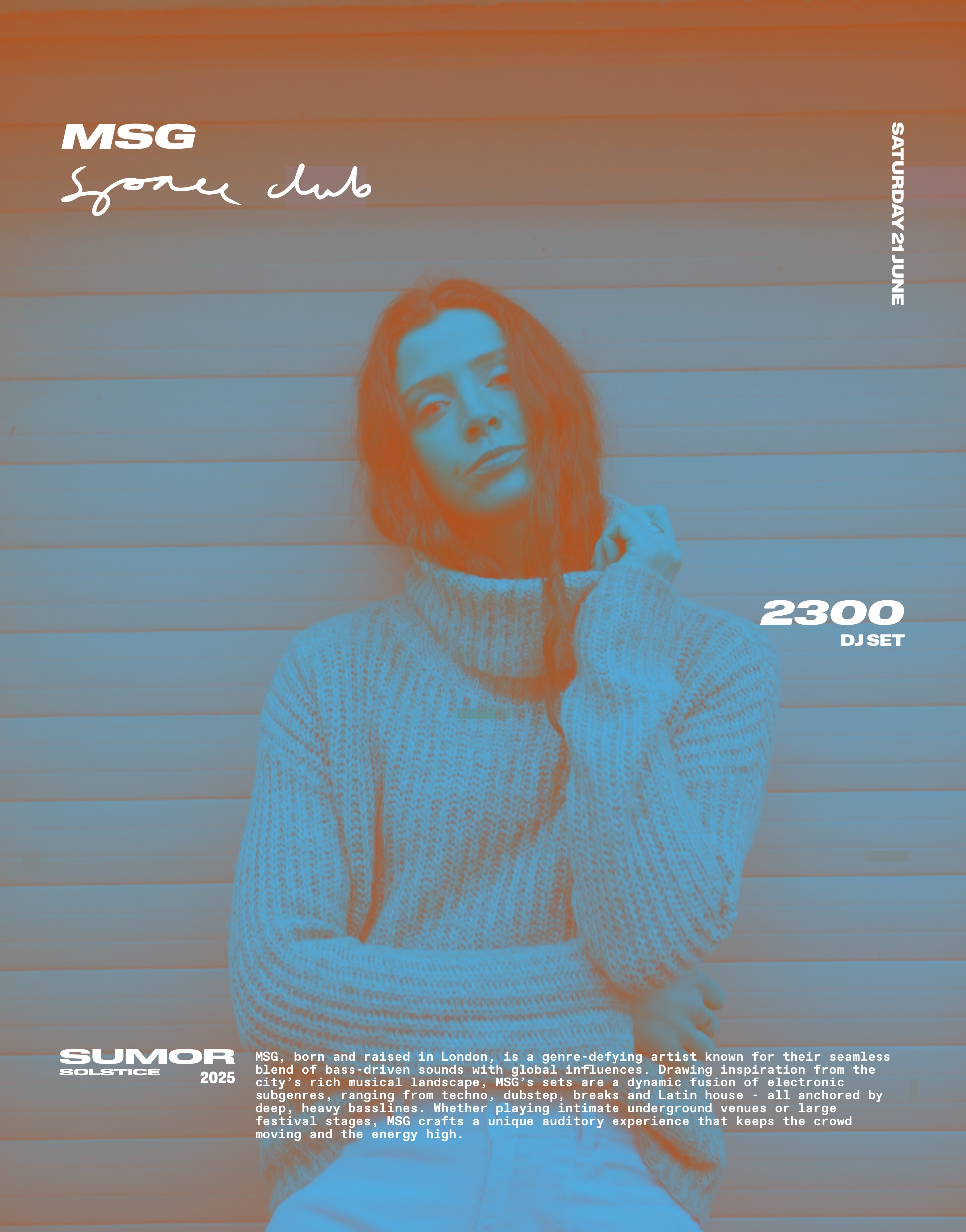 MSG, born and raised in London, is a genre-defying artist known for their seamless blend of bass-driven sounds with global influences. Drawing inspiration from the city’s rich musical landscape, MSG’s sets are a dynamic fusion of electronic subgenres, ranging from techno, dubstep, breaks and Latin house - all anchored by deep, heavy basslines. Whether playing intimate underground venues or large festival stages, MSG crafts a unique auditory experience that keeps the crowd moving and the energy high.