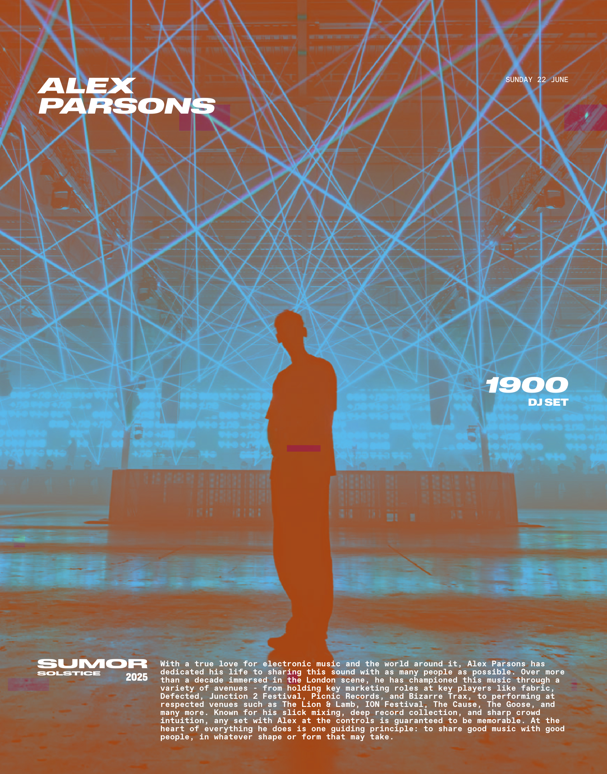 With a true love for electronic music and the world around it, Alex Parsons has dedicated his life to sharing this sound with as many people as possible. Over more than a decade immersed in the London scene, he has championed this music through a variety of avenues - from holding key marketing roles at key players like fabric, Defected, Junction 2 Festival, Picnic Records, and Bizarre Trax, to performing at respected venues such as The Lion & Lamb, ION Festival, The Cause, The Goose, and many more. Known for his slick mixing, deep record collection, and sharp crowd intuition, any set with Alex at the controls is guaranteed to be memorable. At the heart of everything he does is one guiding principle: to share good music with good people, in whatever shape or form that may take.