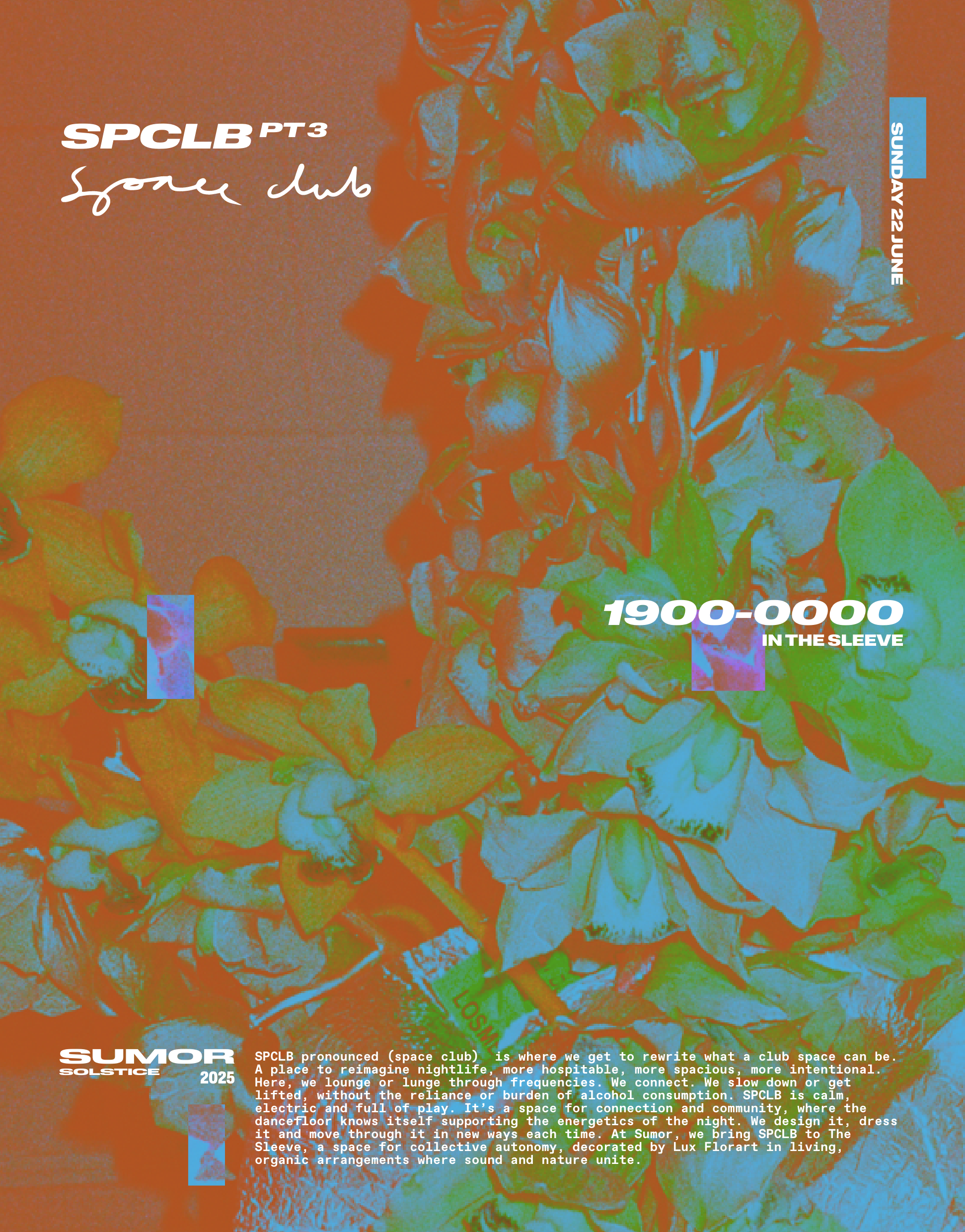 SPCLB pronounced (space club) is where we get to rewrite what a club space can be. A place to reimagine nightlife, more hospitable, more spacious, more intentional. Here, we lounge or lunge through frequencies. We connect. We slow down or get lifted, without the reliance or burden of alcohol consumption. SPCLB is calm, electric and full of play. It’s a space for connection and community, where the dancefloor knows itself supporting the energetics of the night. We design it, dress it and move through it in new ways each time. At Sumor, we bring SPCLB to The Sleeve, a space for collective autonomy, decorated by Lux Florart in living, organic arrangements where sound and nature unite.