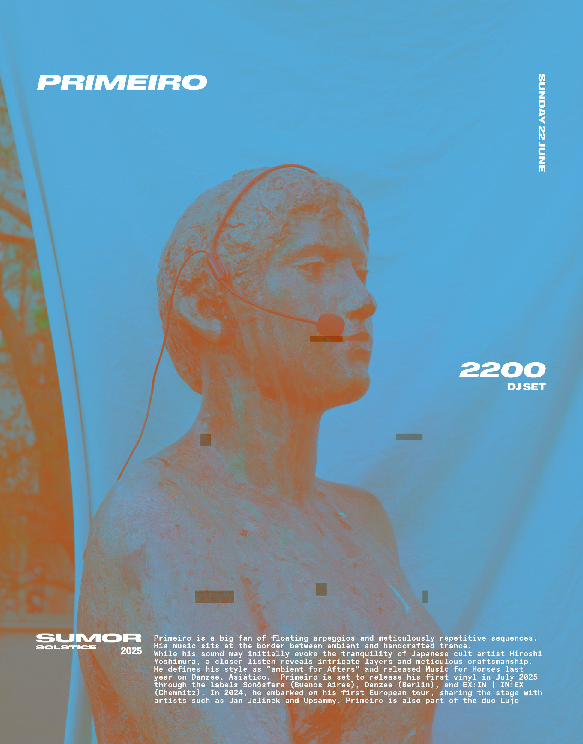 While his sound may initially evoke the tranquility of Japanese cult artist Hiroshi Yoshimura, a closer listen reveals intricate layers and meticulous craftsmanship. He defines his style as “ambient for Afters” and released Music for Horses last year on Danzee. Asiático. Primeiro is set to release his first vinyl in July 2025 through the labels Sonôsfera (Buenos Aires), Danzee (Berlin), and EX:IN | IN:EX (Chemnitz). In 2024, he embarked on his first European tour, sharing the stage with artists such as Jan Jelinek and Upsammy. Primeiro is also part of the duo Lujo