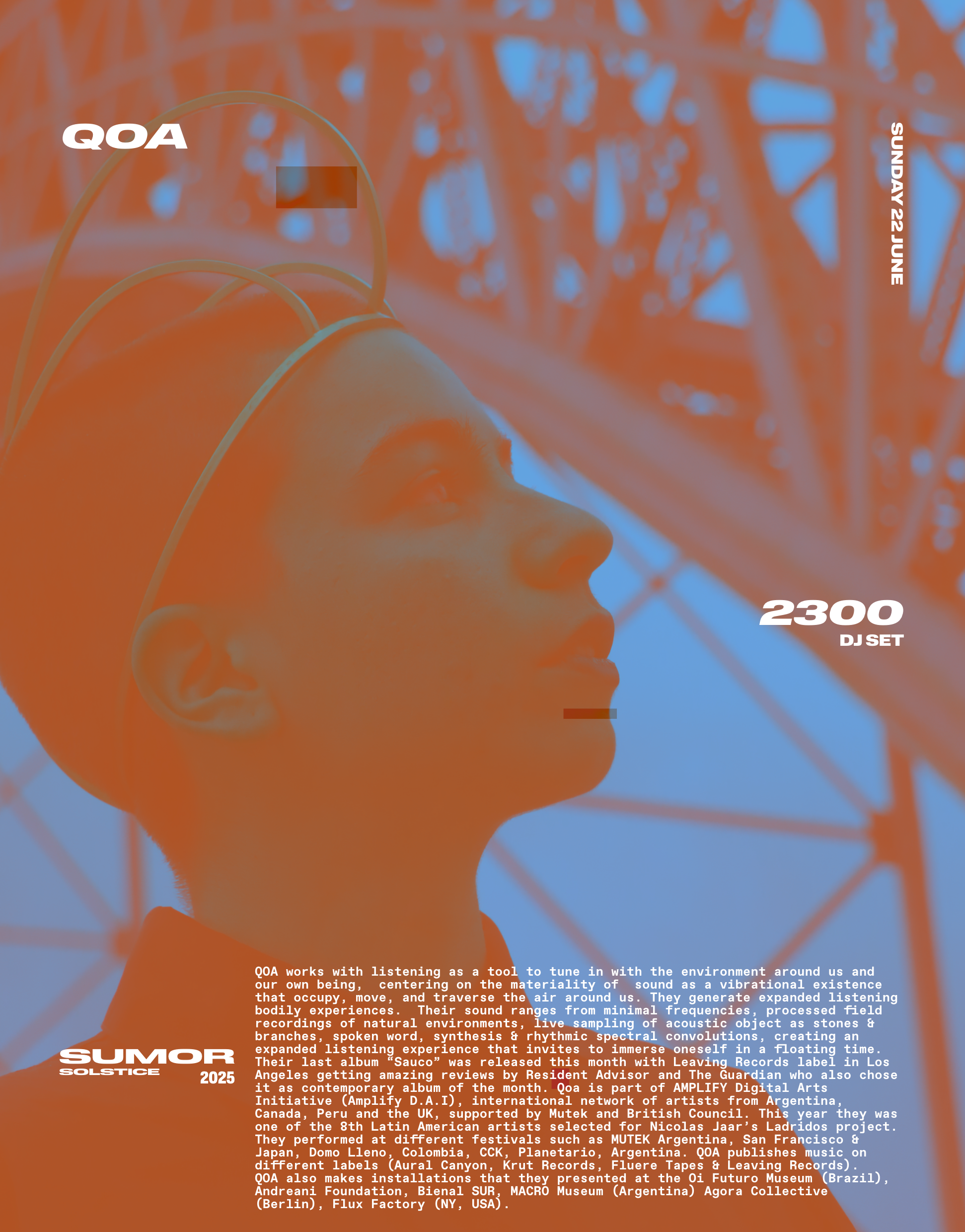 QOA works with listening as a tool to tune in with the environment around us and our own being, centering on the materiality of sound as a vibrational existence that occupy, move, and traverse the air around us. They generate expanded listening bodily experiences. Their sound ranges from minimal frequencies, processed field recordings of natural environments, live sampling of acoustic object as stones & branches, spoken word, synthesis & rhythmic spectral convolutions, creating an expanded listening experience that invites to immerse oneself in a floating time.