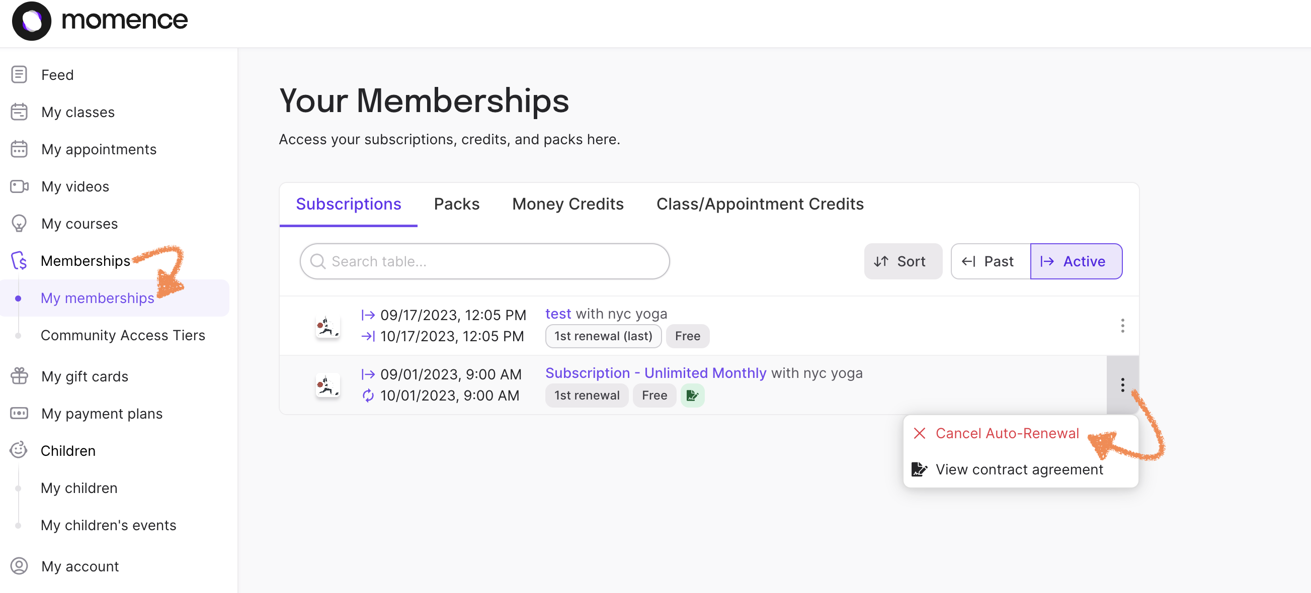 2. Click Memberships > My Memberships > locate the Subscription & click Cancel