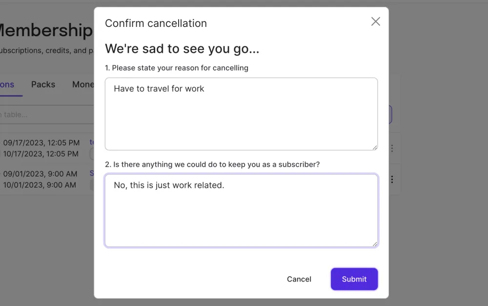 3. You'll be required to provide feedback in a pop up before cancelling. (You may see a minimum number of words required to submit).