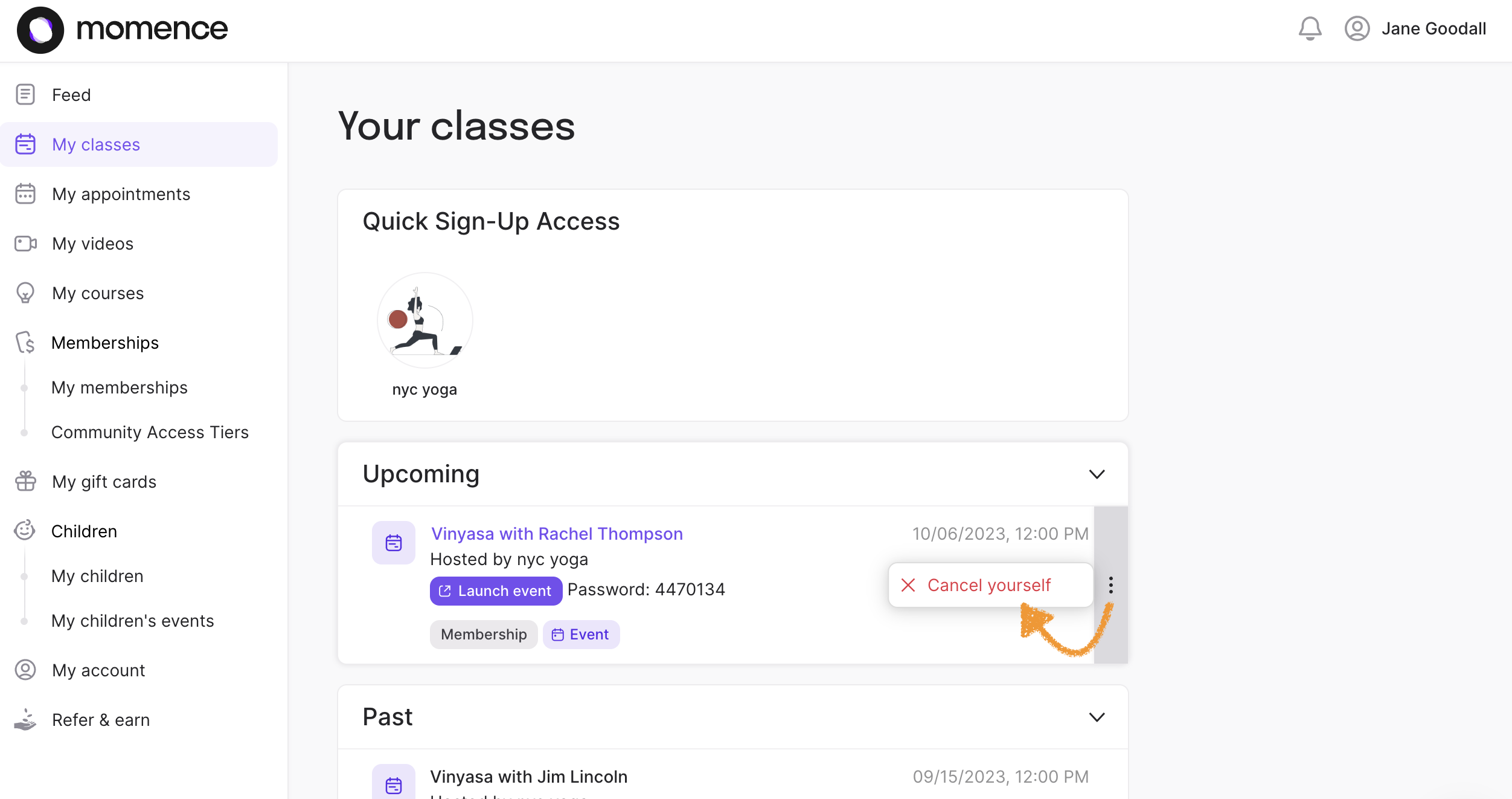 Go to your Momence login on your computer or smartphone and find the 3 dots where you can select to cancel your booking.