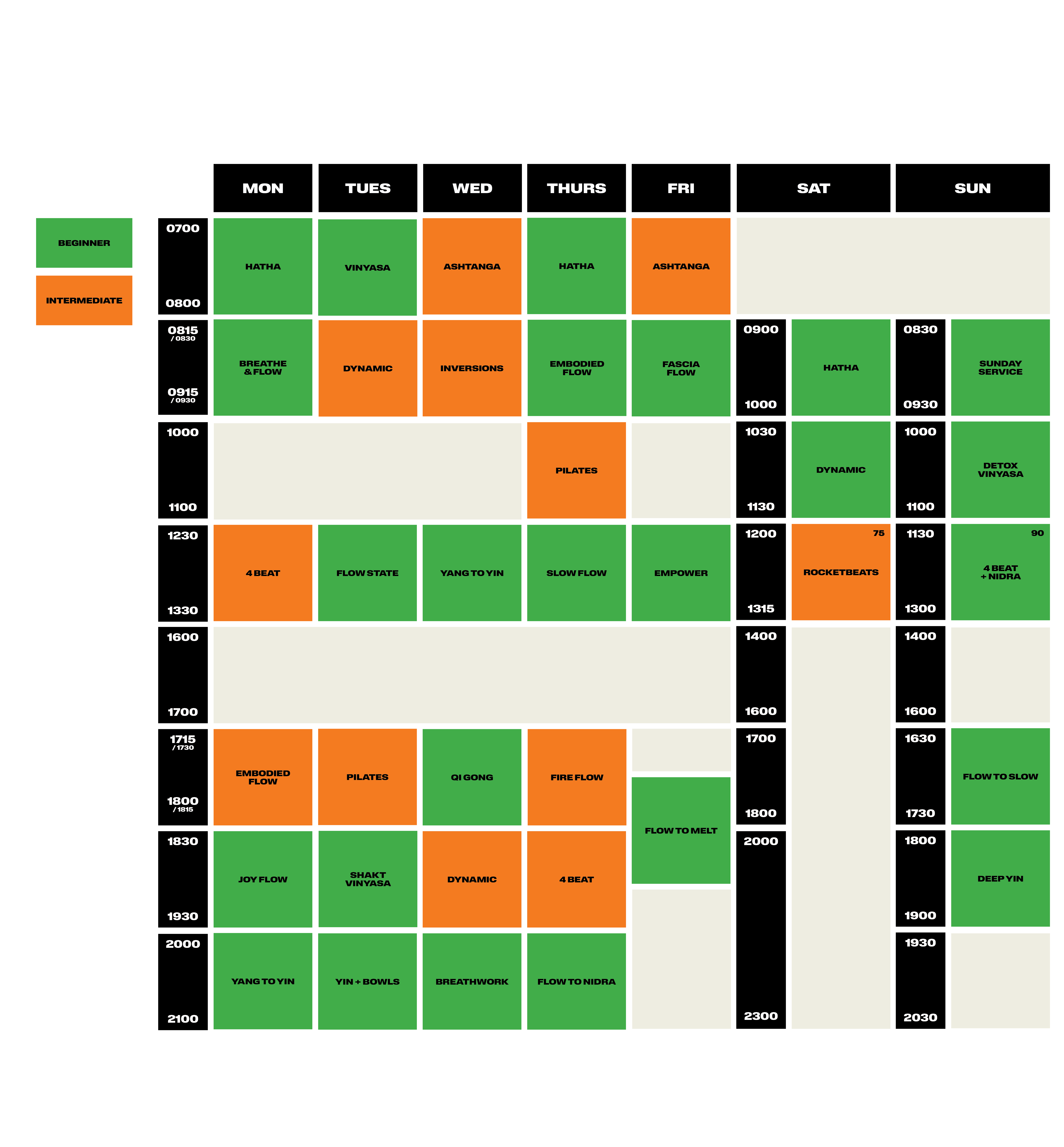 Start the day with a traditional asana practice in hatha or ashtanga then move through the day with flow fusion movement modalities and end with our typical set of energy cultivating, movement and down regulating sessions. At the weekends we open the timetable for special events and workshops, Space Club and Deep Listening Room and Circles.