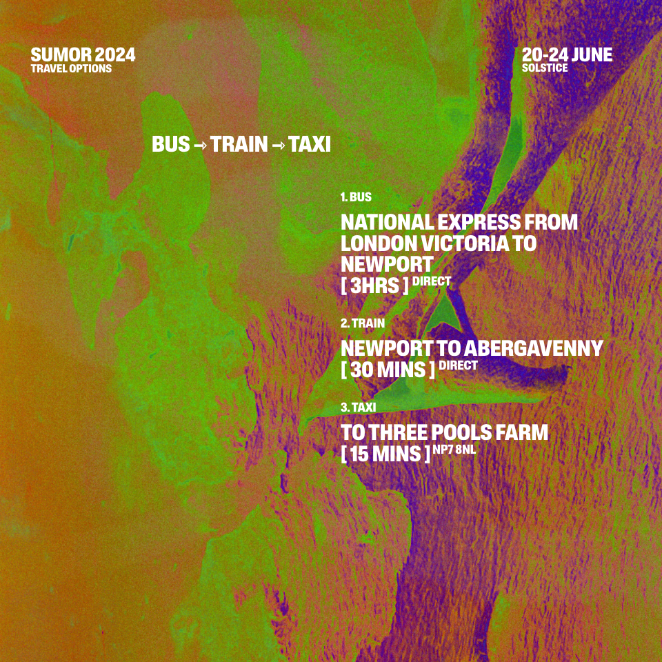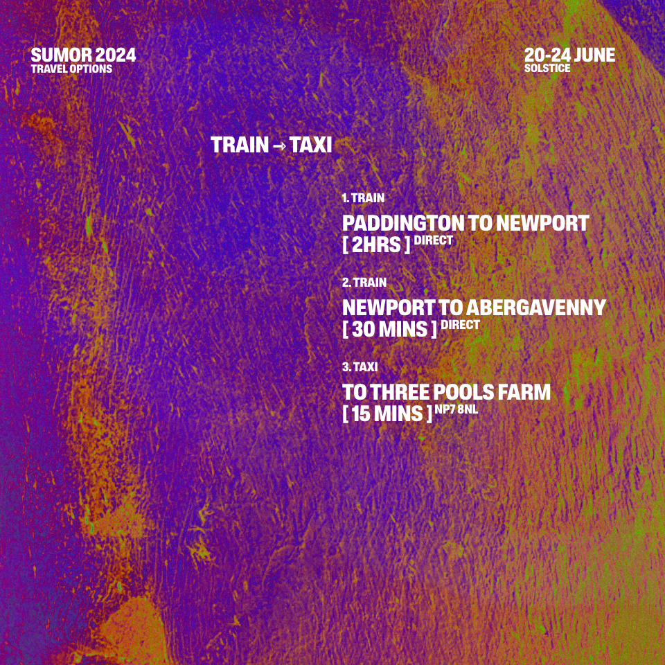The nearest train station Abergavenny, is 15 minutes drive from Three Pools Farm . taxis are available from the station to the festival site. From London, leave from Paddington and change at Newport (Wales) for Abergavenny. Paddington-Abergaveny ETA 2h15mins by train.