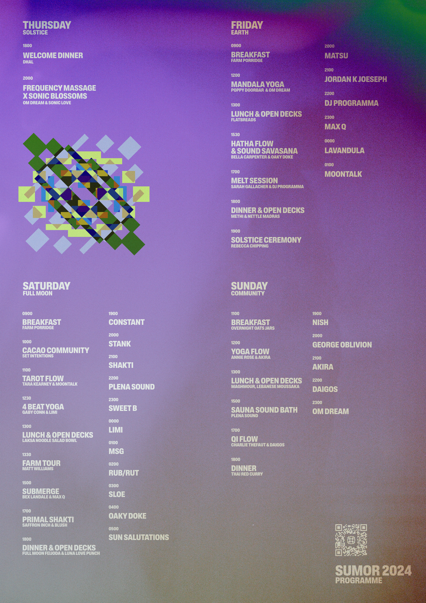 DJ Programma, Gaby Conn, George Oblivian, Jordan K Joseph, Lavandula, Limi, Matsu, Max Q, Moontalk, MSG, Nishanti, Oaky Doke, Om Dream, Plena Sound, Poppy Doorbar, Rebecca Chipping, Rub/Rut, Sarah Gallacher, Saffron Inch, Sonic Love, Stank, Shakti, Sweet B, Sloe, Tara Kearney